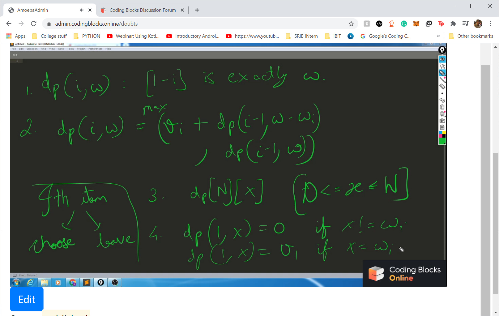 hence we can iterate on all dp[N][x] where x belongs to 0 to W and maximum among them will be our answer - tells the base case when only 1 item then dp[1][w1]=v1 and dp[1][x]=0 for x!=w1