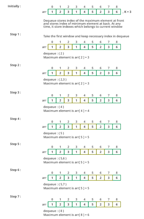 We create a Deque, Qi of capacity k, that stores only useful elements of current window of k elements. An element is useful if it is in current window and is greater than all other elements on left side of it in current window. We process all array elements one by one and maintain Qi to contain useful elements of current window and these useful elements are maintained in sorted order. The element at front of the Qi is the largest and element at rear of Qi is the smallest of current window.