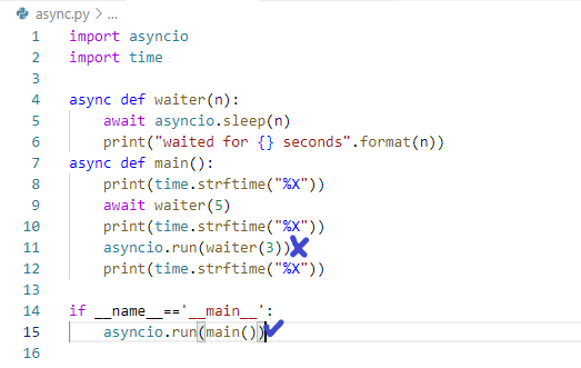 why can i use asyncio.run near the tick sign but not at the cross sign?