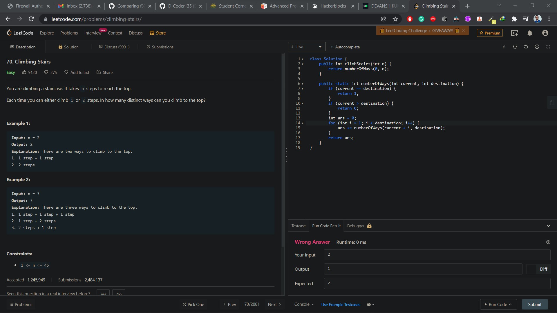 The code explained by Monu Sir is not accepted on the Leetcode for input 2. On Leetcode, answer expected is 2 but as per the code explained by Monu Sir the output is 1.