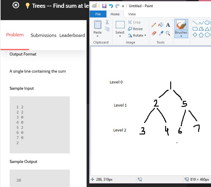 I am not able to understand the sample input given in the problem i.e what do the left-side values and right-side values signify and how at level 2 sum is 20.