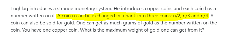 when i exchange coins into its counterpart only when possible ((n/2,n/3,n/4) using if(n/2 == 0)) i fail the cases