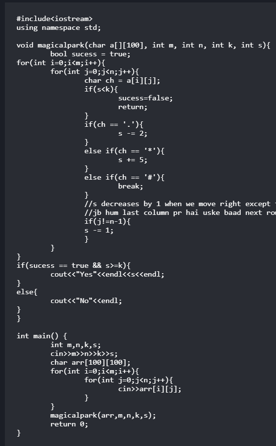Hello @mahima when you have find that your strength is less than k at anypoint then you have to break you should not return in that case because if you will return then your code will not print ‘no’ for that answer.Infact there will be no ouput for that answer becaus you have then returned to the main from where you have called this fucntion.