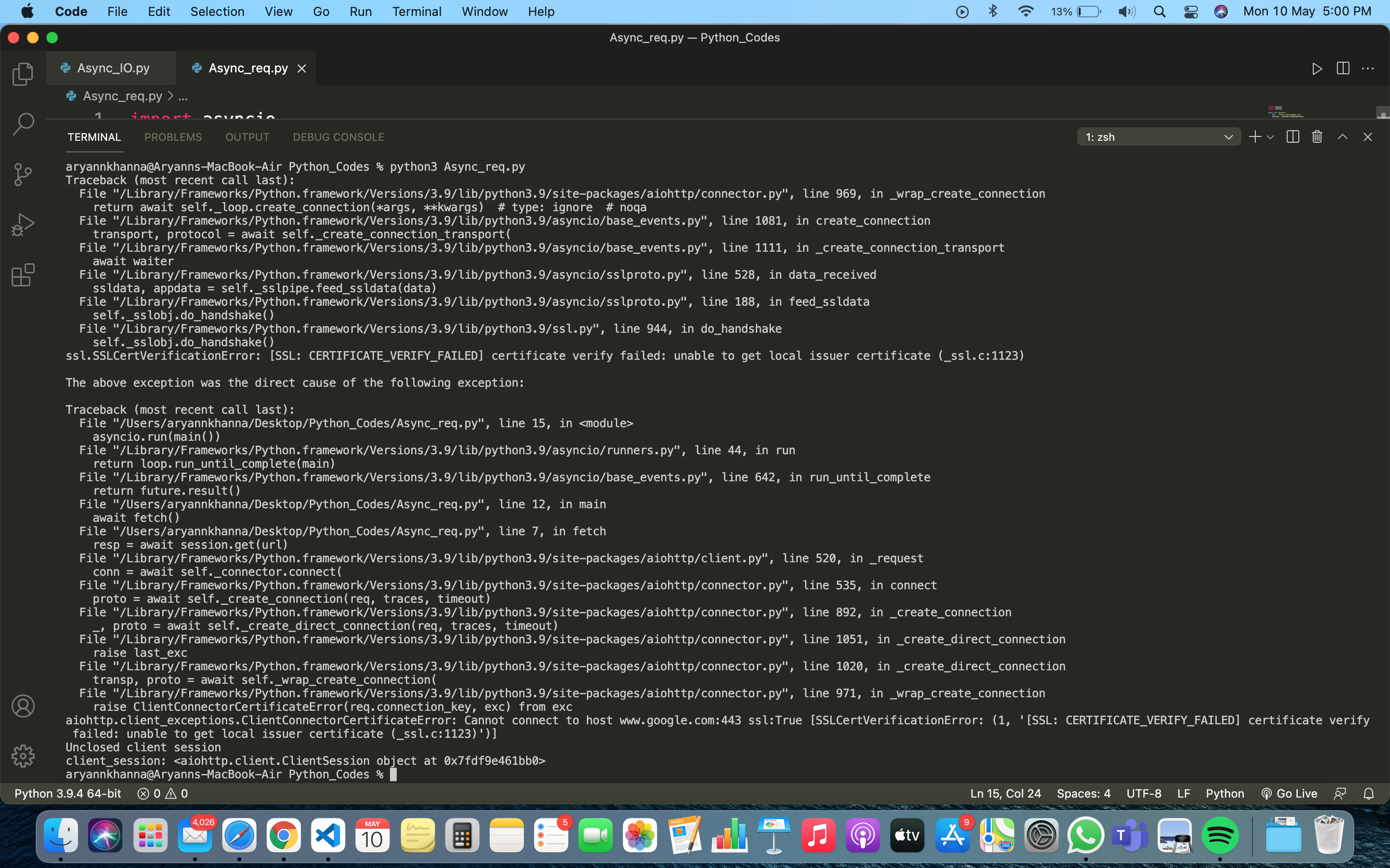 You are getting this error because your SSL certificates are not installed properly or need to be updated go to Macintosh HD > Applications > Python3.7 folder (or whatever version of python you’re using) > double click on “Install Certificates.command” file.