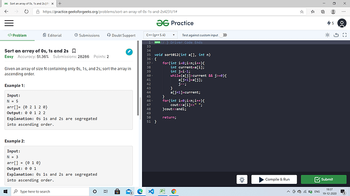 Whereas as far as this problem is concerned. It’s in your course too where they have taught you to sort this in O(N) time complexity. So i would suggest you to do that algorithm in this question instead of using insertion sort. If you have any other doubt related to this, feel free to ask.