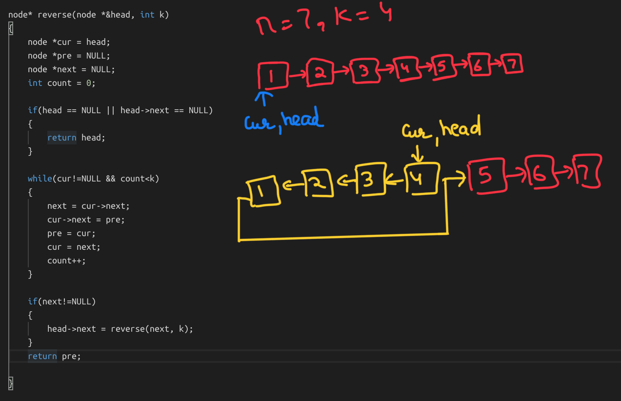 Isko recursively socho. Jaise maan lo ki hume first 3 elements ko reverse krdiya , uske baad humne recursion ko bola ki jao, bachi hui linked list ko bhi 3 ke group mai reverse krke aao.