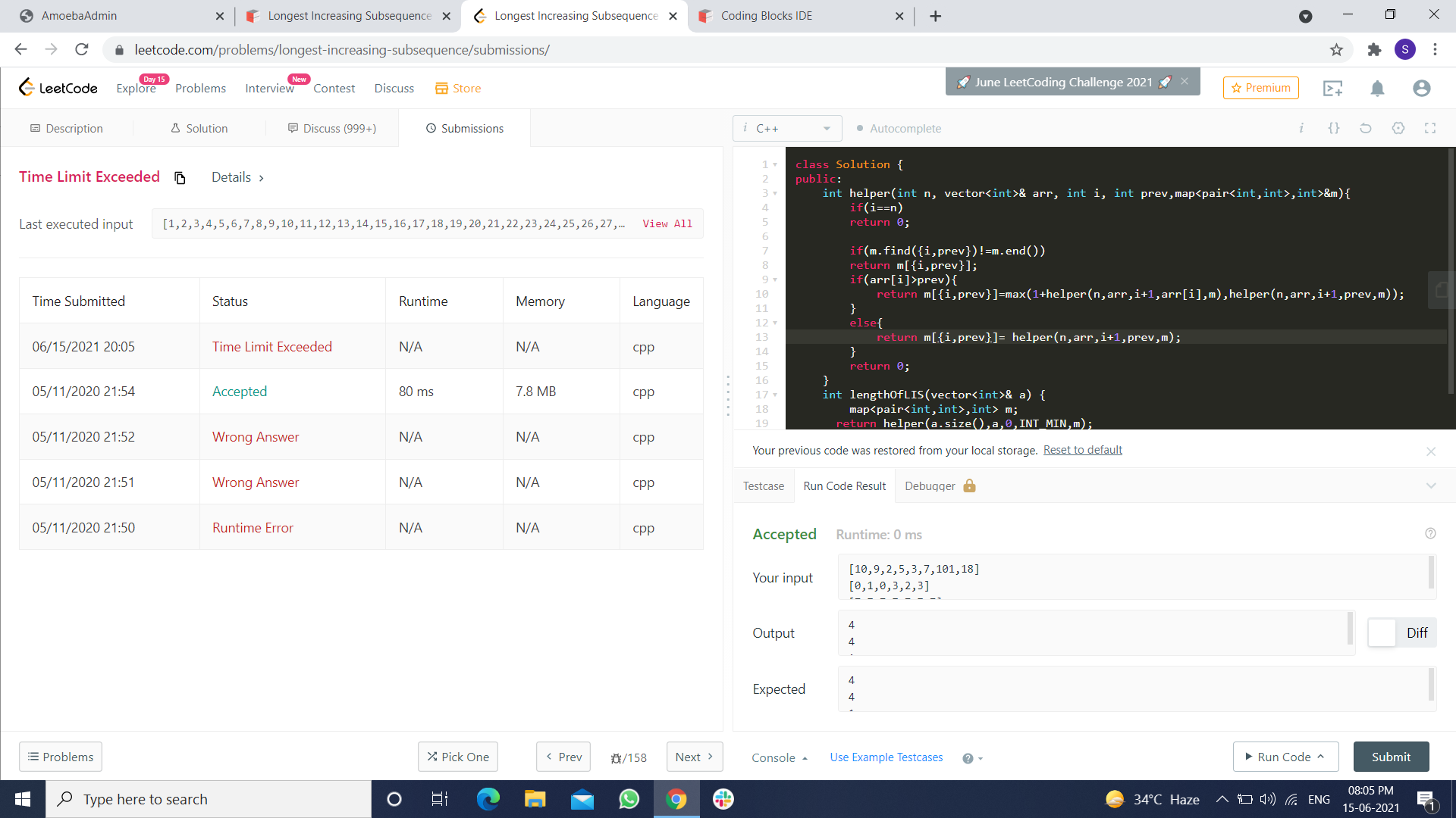 Two parameters are changing your in recursive function. So ideally, a 2d dp should be used. Now we are getting TLE.