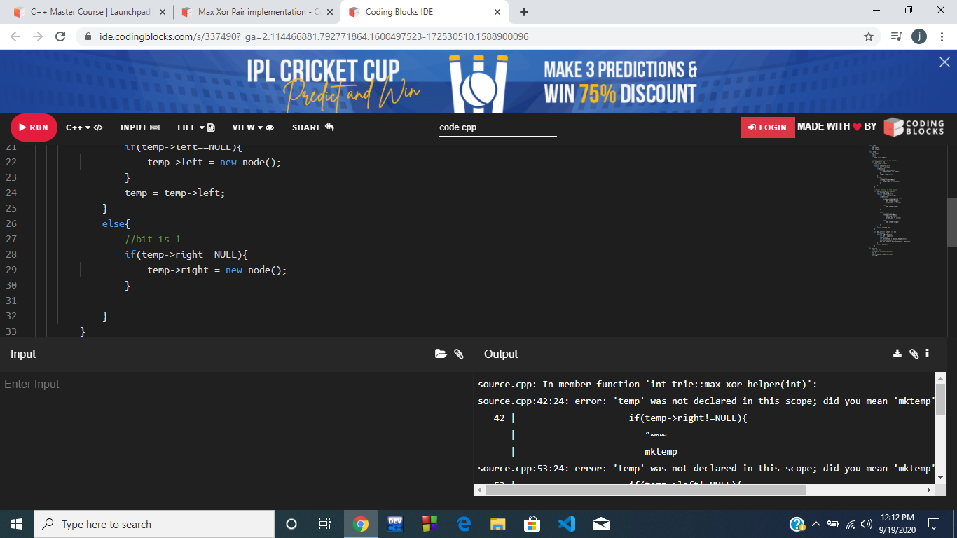 hey @jatinupadhyay786 your code has many mistakes . you dont even intialised the array properly , have not declared the temp variable. I am giving you my code which slightly different from yours i.e I have not made class trie like you . see the attached code.