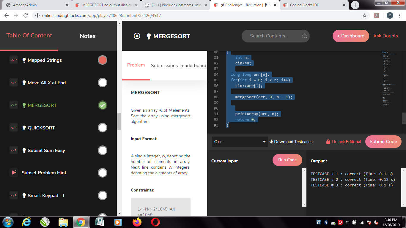 this is my code I am getting correct ouput on my own compiler but no output on coding blocks ide while submission the code runs some times than stops without producing anything , please check my code and do the needful