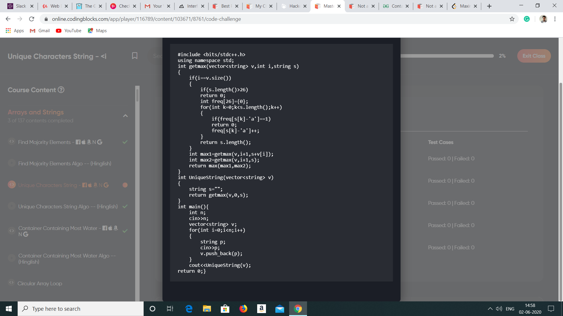 So,in the above example whole array will be concatenated to s. So,as you can see u appears 2 times.So,it will return 0. So,the output should be 0 but actual output will be 4.That’s my point of confusion.That’s why i am seeing please show the dry run for the example i have given above