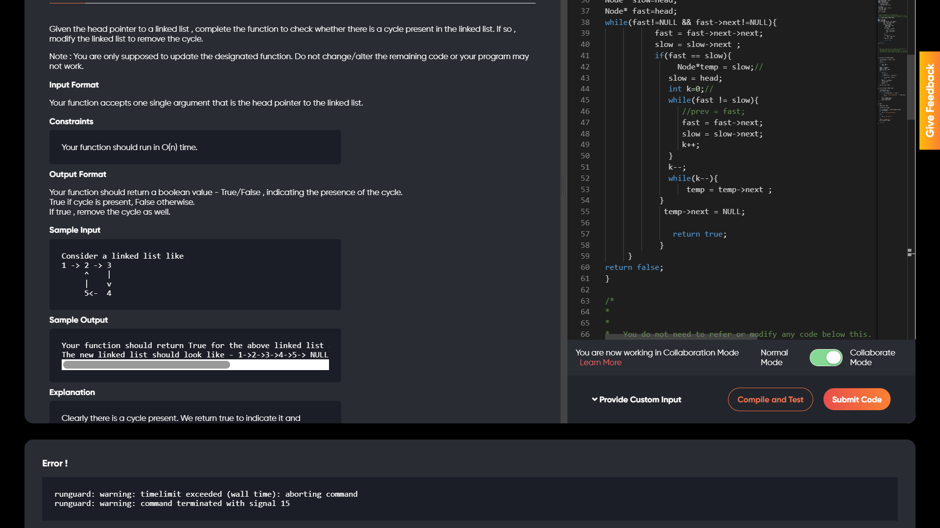 Not passing all the test cases please check i think it is due to an additional function made by me to remove the cycle in a linked list