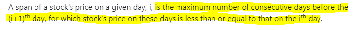 b) after that check whether stack is empty or not if it is empty then span will be i+1 otherwise span will be i-stk.top()