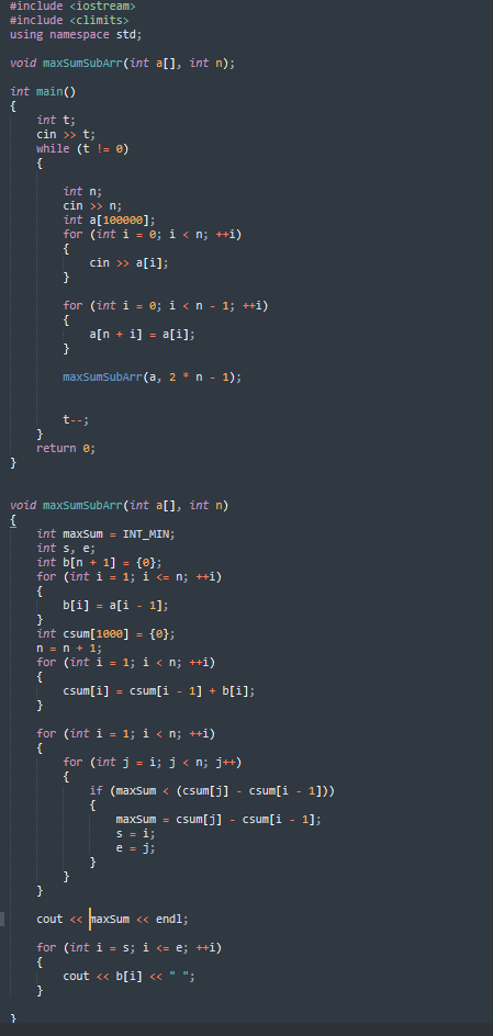 Case 1: The elements that contribute to the maximum sum are arranged such that no wrapping is there. Examples: {-10, 2, -1, 5}, {-2, 4, -1, 4, -1}. In this case, Kadane’s algorithm will produce the result.