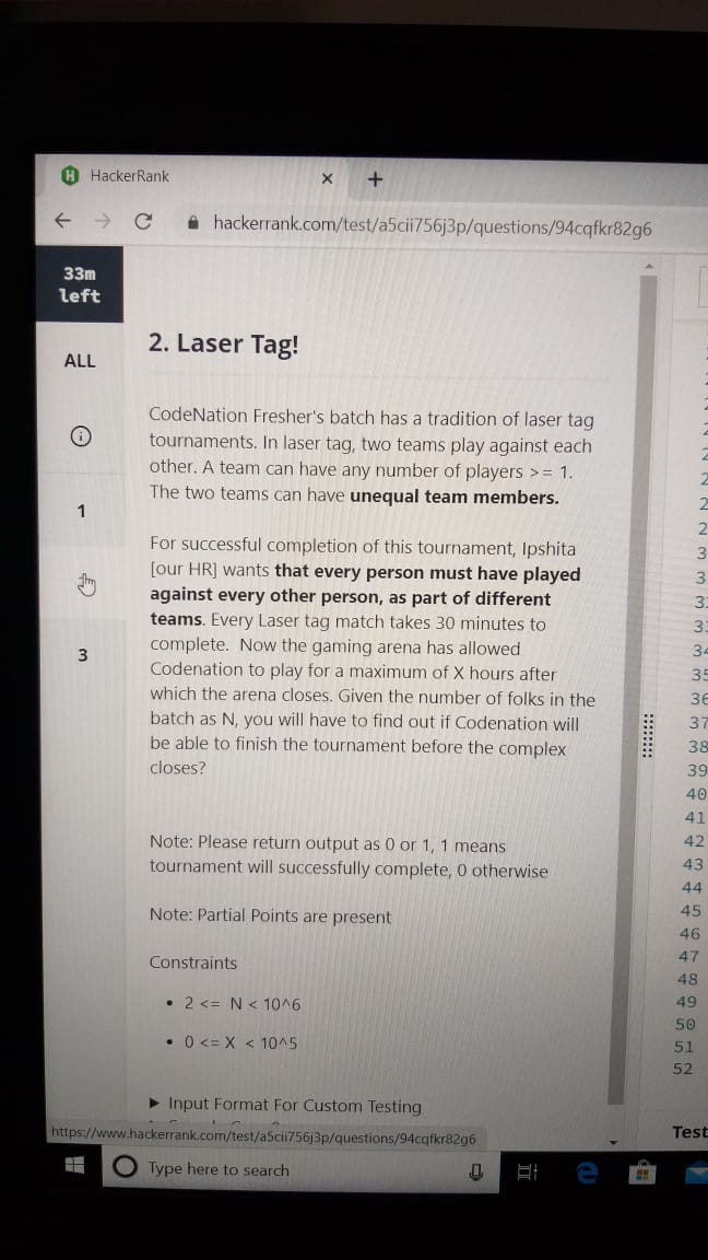 And for 2nd ques we can see that if we try to divide the members equally then we can have the optimal arrangement and can always be sure with that arrangement as we are trying to divide the teams to be equal. And a match takes 30 mins. and so if we consider X hours then we can have total 2X matches. And so on we just need to check if 2X >= log2(n) if yes return 1 else 0.