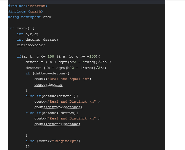 #include using namespace std; #include #include <math.h> int main() { int a,b,c; int det1,det2; cin>>a>>b>>c; if(a,b,c>= -100 && a,b,c <= 100){ det1 = (-b + sqrt(pow(b,2) - 4ac))/2a; det2 = (-b - sqrt(pow(b,2) - 4ac))/2a ; if(det1==det2){ cout<<“Real and Equal”<<det1; } else if (det1 > det2) { cout<<“Real and Distinct”<<endl; cout<< det2<<" " << det1<<endl ;} else if (det2>det1){ cout<<“Real and Distinct”<<endl; cout<< det1 <<" " << det2 <<endl ; } else{cout<<“Imaginary”;} } }