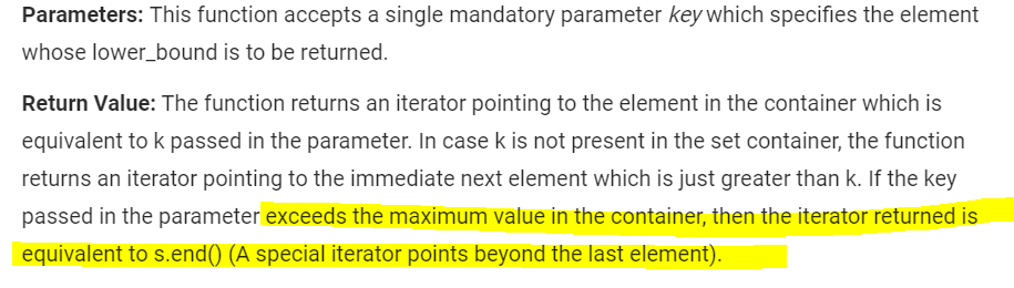 https://www.geeksforgeeks.org/set-lower_bound-function-in-c-stl/ But as here it is written and also told in the lectures that…"If the key passed in the parameter exceeds the maximum value in the container, then the iterator returned is equivalent to s.end() "…and we dont know what is the value at s.end()… so it should be garbage value…It is nowhere written that if key is maxm than largest element…it will return size of array