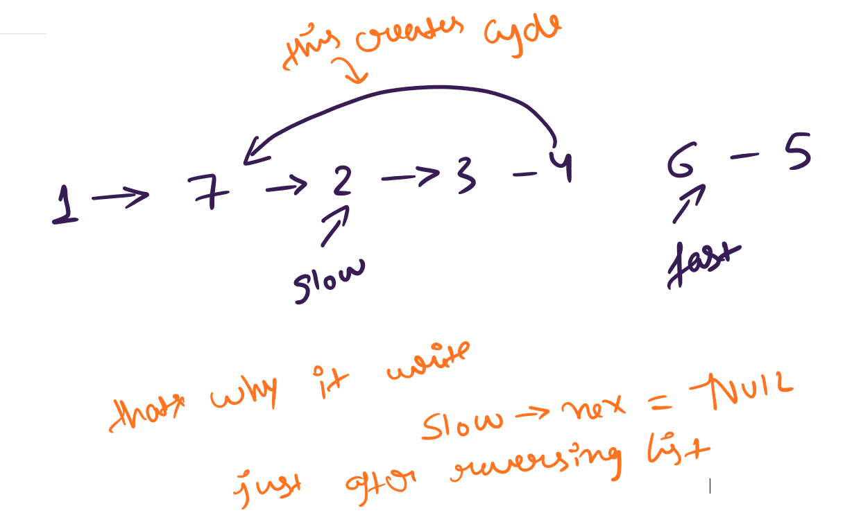 Sir can you pls elaborate how a cycle is formed without adding slow->next=NULL;