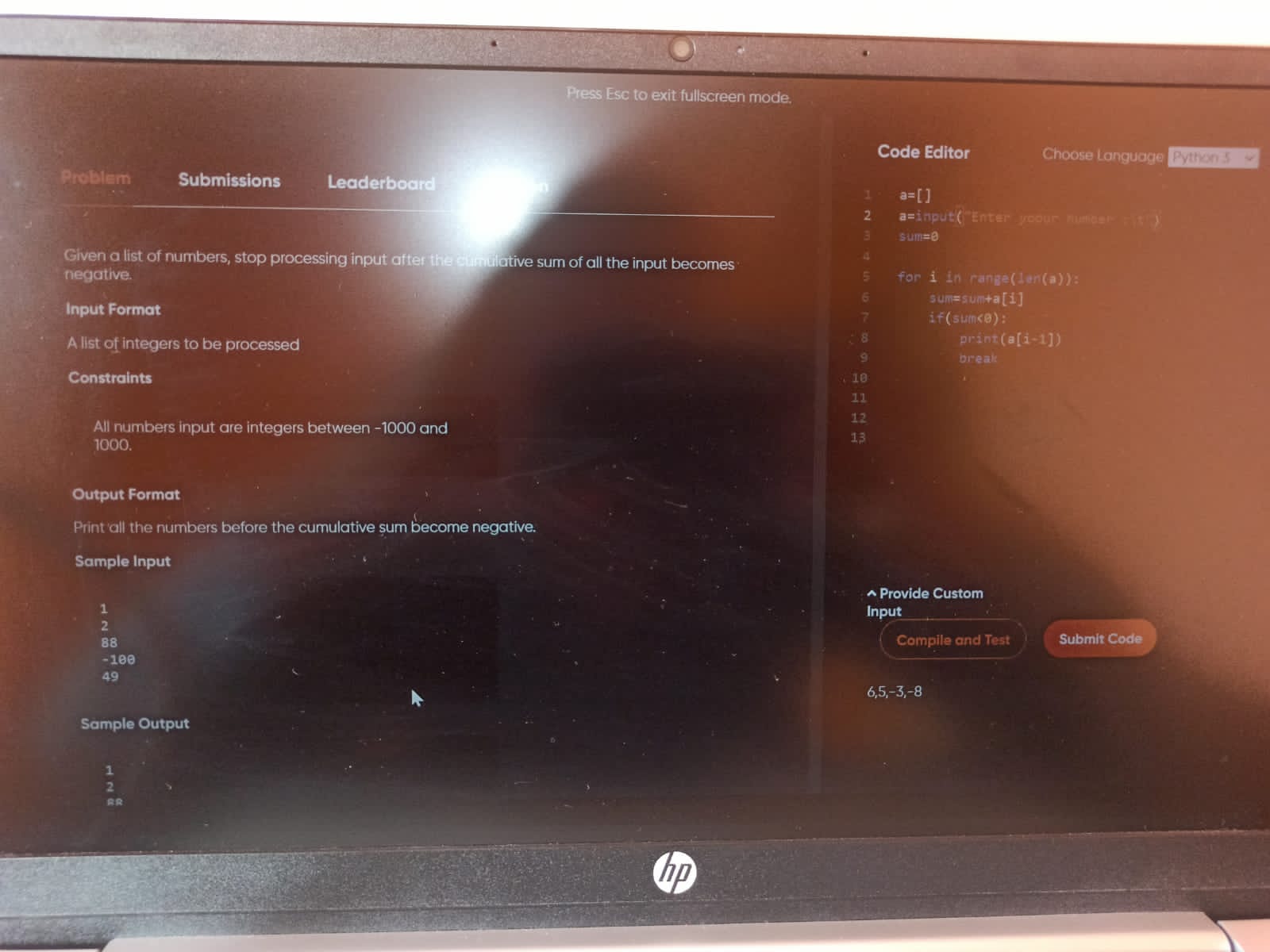 So look first the sum is 3 so it the element of that position is printed. Now the sum is 7 so 4 is printed but after entering -10 in the stream the sum becomes -3<0 so not printed.