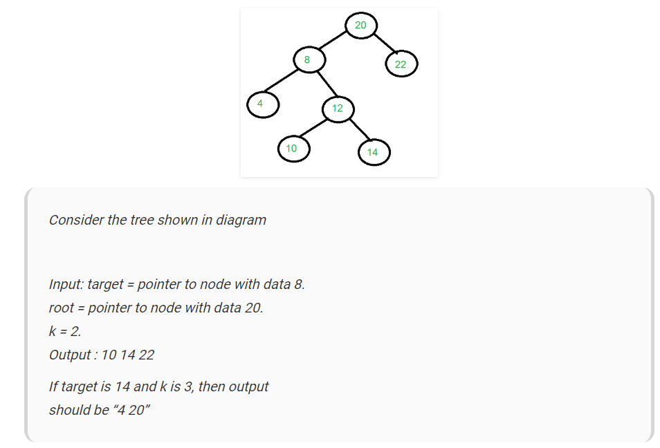 2) Other nodes, may be an ancestor of target, or a node in some other subtree. For target node 8 and k is 2, the node 22 comes in this category.