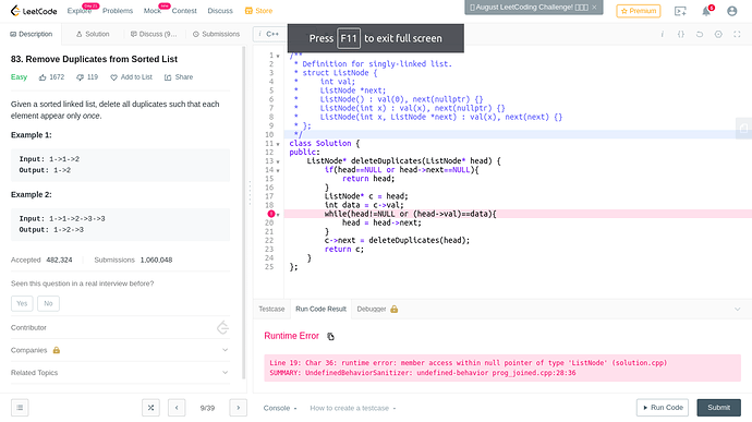 while(temp->next && temp->val==temp->next->val)