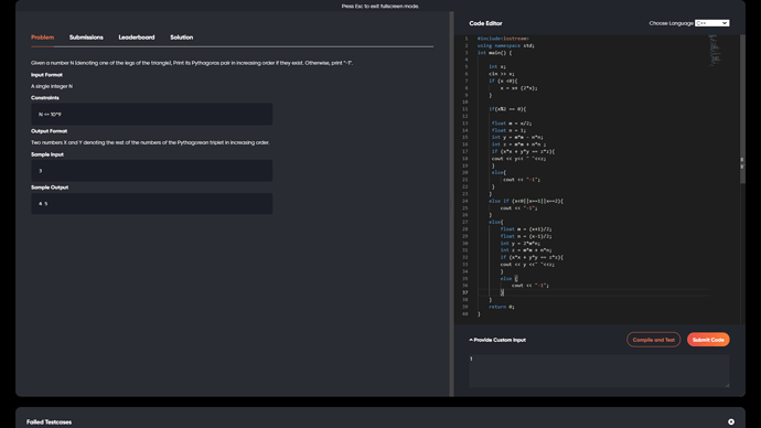 #include using namespace std; int main() { int x; cin >> x; if(x%2==0){ float m = x/2; float n = 1; int y = mm - nn; int z = mm + nn; } } else if(x<0||x==1||x==2){ cout << “-1”; } else{ float m = (x+1)/2; float n = (x-1)/2; int y= 2mn; int z = mm +nn; if(xx +yy == z*z){ cout << y<<" "<< z; } else{ cout << “-1”; } return 0; }
